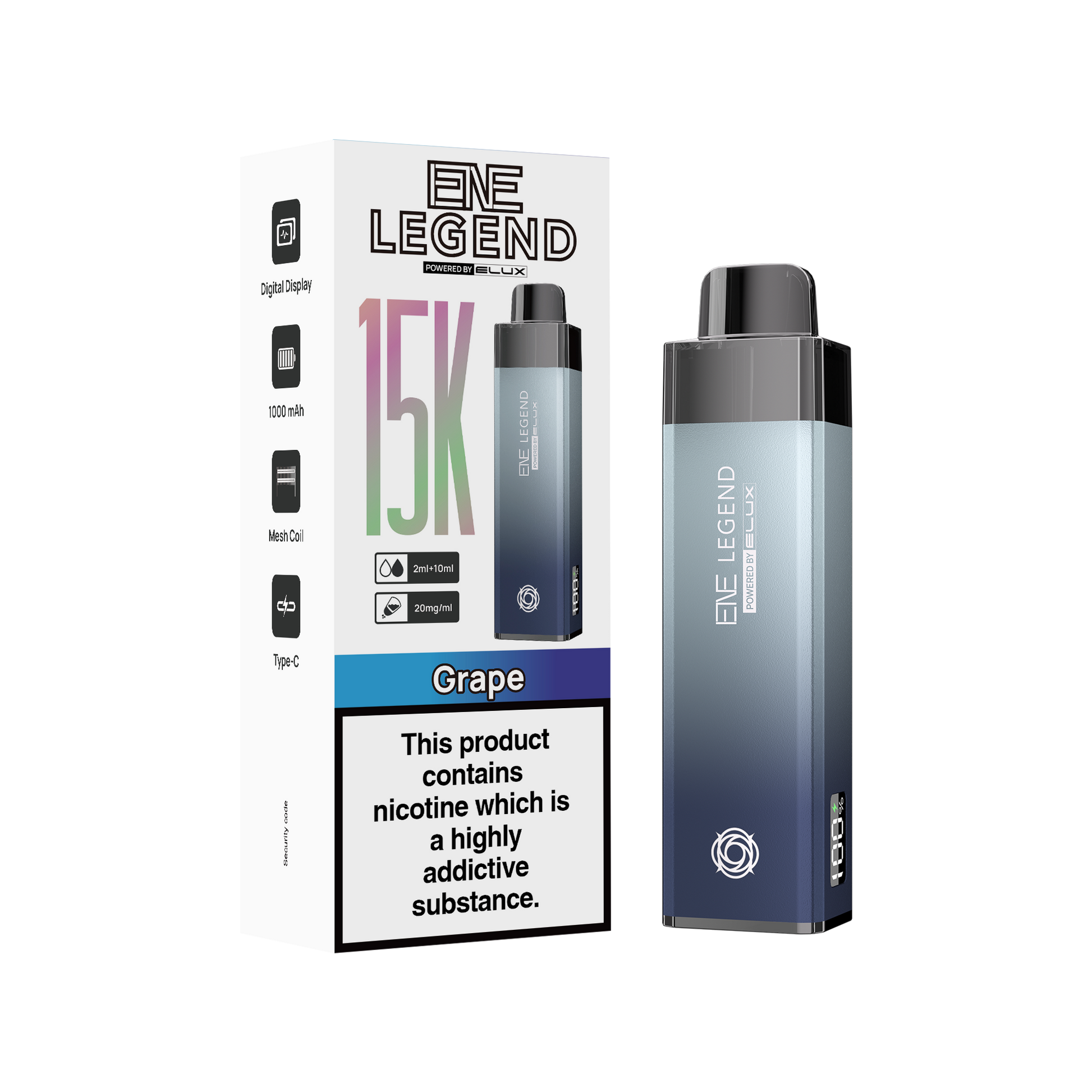 Each ELUX ENE Legend 15k device doesn't come pre-installed with liquid, instead giving you a 10ml pre-filled bottle of 20mg nicotine salt e-liquid and come available in 20 delicious and refreshing flavours.  These 10ml pre-filled bottles can be easily installed to the device by pushing and clicking them in.  Each ELUX ENE Legend 15k device has a coil built to last roughly 15000 puffs which is complimented by the rechargeable battery, which will of course depend on how long you like to puff for, but is based on rigorous lab testing with puffs of 1.5 seconds.