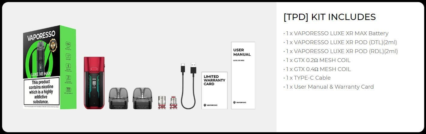 - 1 x Vaporesso LUXE XR Max Pod Kit