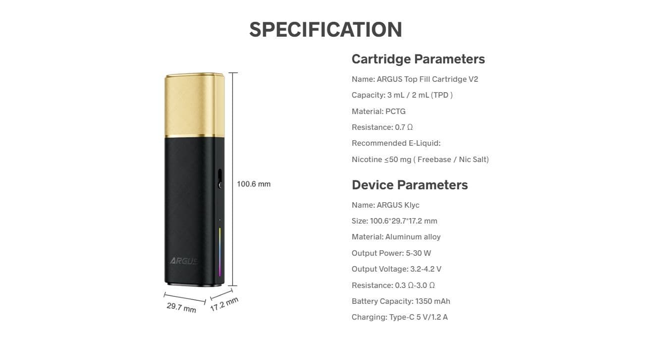 The specifications of the Argus Klyc Pod include: